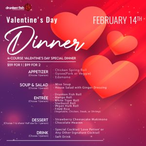 Drunken Fish Westport, February 14th—There’s nothing more romantic than a fancy, four-course meal and specialty cocktails so why not spend Valentine’s Day at Drunken Fish? The Valentines Day Dinner Special will feature a four course prix dinner menu and includes one select cocktail per person. Price is $99 for two. Don’t wait to make your Valentine’s Day special, call Drunken Fish today at 314-275-8300.