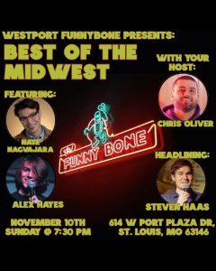 November 10th, Funny Bone Westport—"Best of the Midwest" is a comedy showcase spotlighting the Midwest's funniest comedians. The lineup includes Alex Hayes and Nate Nagvajara, with the hilarious Steven Haas headlining the show! Your host for the evening is none other than Chris Oliver. Get your tickets today!