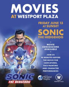 Westport Plaza, Friday, June 13th—Don’t miss Movie Night featuring Sonic the Hedgehog at Westport Plaza on Friday, June 13th . Get ready for a high-speed, action-packed night the whole family will love! Arrive 90 minutes before the movie begins at sunset for you to enjoy yard games, face painting, caricatures, character performances and movie concession. Bring your family, friends, and all your favorite Sonic fans for a night of FREE fun and thrills you won’t want to miss.